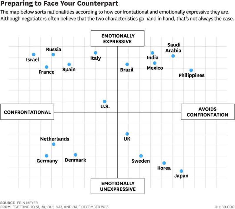 Heute fiel mir eine Grafik auf, die verschiedene Nationalitäten hinsichtlich ihrer Konfrontationsbereitschaft und ihrer Emotionsbereitschaft positioniert.